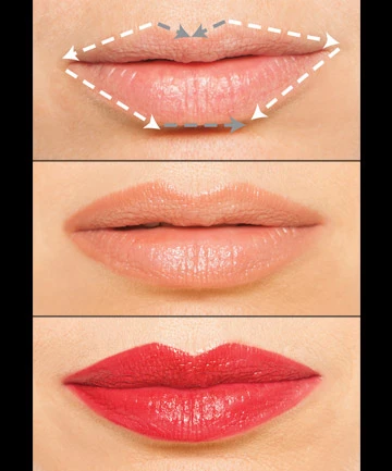 - Create a full, seductive lips by drawing a V -shape on the upper lip.Then draw a dash under the center of the lower lip, quickly connect them together (with dim lines) to create a perfect balance.To make the lips bigger, the ladies just draw lightly outside the corners of the mouth.Fill the lips with a first layer of lipstick and then apply the color you prefer.