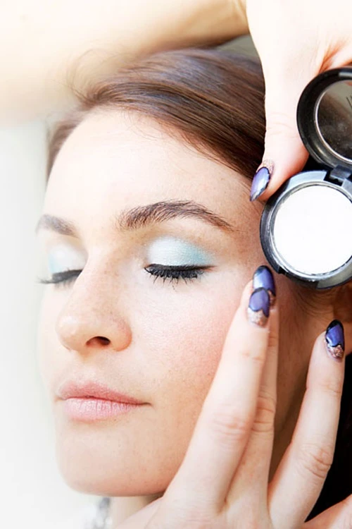 Eye lightening:You use a highlighter or chalk to cheat a line like an arc from the middle of the eyebrow bone to the end of the eye.This way makes the eyes lighter to cover dark circles.