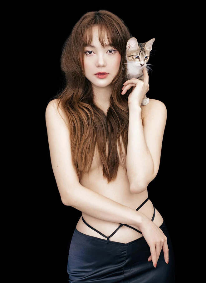 On one side is a feminine makeup with coral orange and clear, natural, and one side is west with nude tones, a makeup tone everyone is wary of because it is easy to make the owner looks sobbing.Minh Loc's treatment is to focus on the eyes, the eyeliner is sharp, long, the eye color is very dark to the overall harmony.
