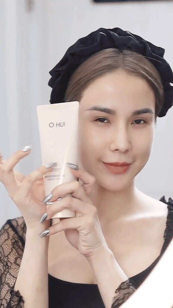 After fully brushing his teeth, Diep Lam Anh washed his face to use the Ohui Hong House cleanser.She shared her that she had the ability to remove dirt and dust combined with gently exfoliating.Moreover, because of the ingredients from peony, it creates a gentle scent, so it is quite pleasant to use.