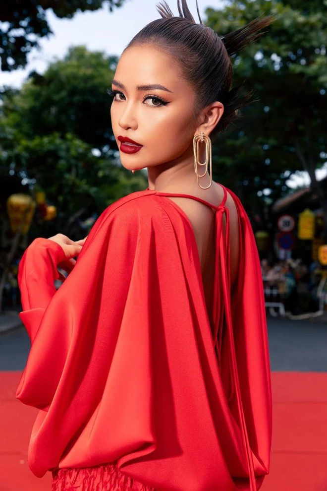 Phu Gia Gia is behind the sharp, attractive makeup layers from nude to the dark red of Miss Ngoc Chau.He focused on the eye with the sharp eyeliner line, hitting the block carefully to enhance the angular beauty, the West of the Hau