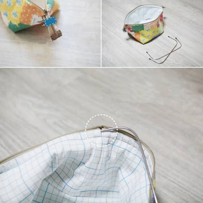 Then, you cut the two ends of the zippers on both sides and sew the small blue rectangular cloth.You thread the U -shaped iron frame into the gap in the checkered car cloth in step 4. After finishing, you have a pretty rectangular tray. |