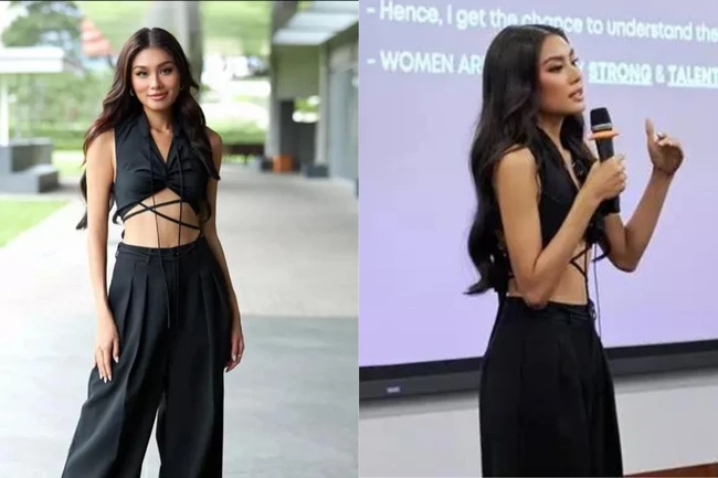 Different from the "closed" style of the Hau girls, when becoming a speaker at the university, runner Thao Nhi Le chose for herself a black outfit with a slender tube pants and crop top cut delicately cut.